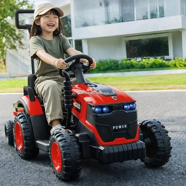 Детский трактор M 6269EBLR-3 красный - сочетает в себе реалистичный дизайн, высокое качество сборки и продуманную функциональность, благодаря чему сразу привлекает внимание ребенка и делает каждую прогулку более увлекательной, модель выполнена в виде настоящего трактора с прицепом, что добавляет игре разнообразия и позволяет перевозить игрушки или небольшие вещи.