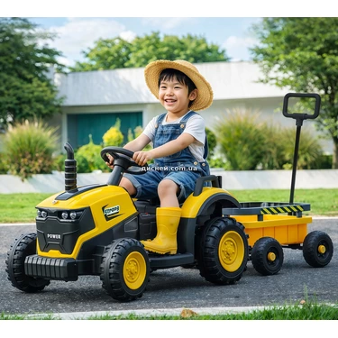 Детский трактор M 6269EBLR-6 желтый - сочетает в себе реалистичный дизайн, высокое качество сборки и продуманную функциональность, благодаря чему сразу привлекает внимание ребенка и делает каждую прогулку более увлекательной, модель выполнена в виде настоящего трактора с прицепом, что добавляет игре разнообразия и позволяет перевозить игрушки или небольшие вещи.
